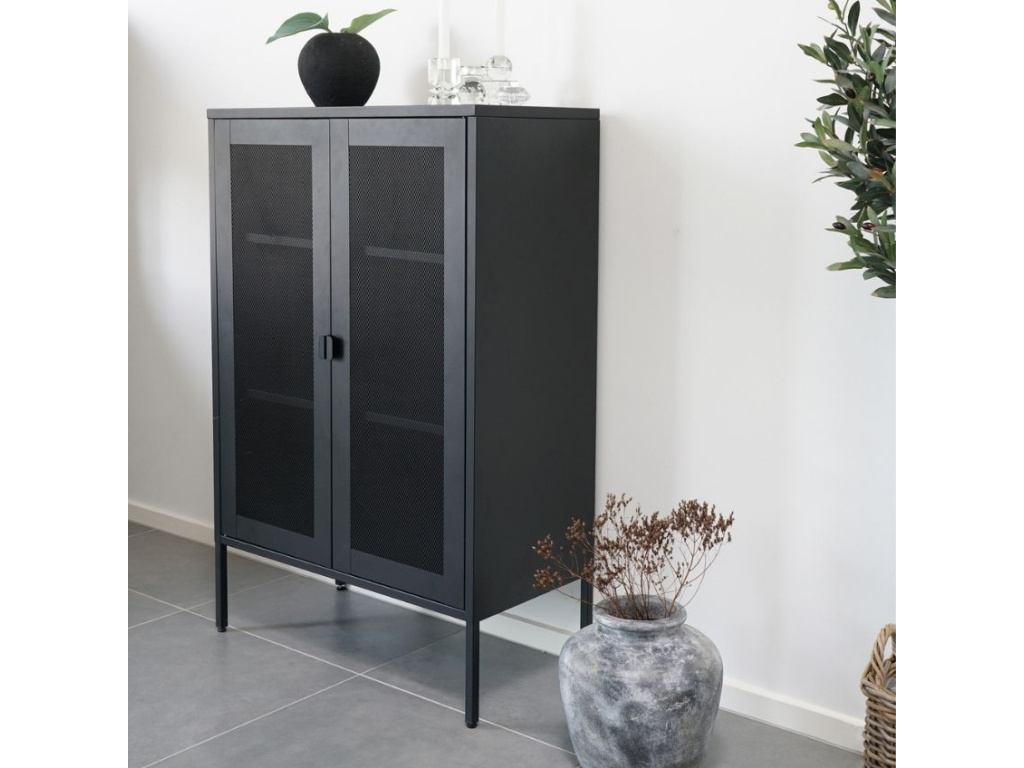 Vitrína Merrisa zapadne díky svému elegantnímu provedení do každého interiéru. Černě lakovaná kovová konstrukce vitríny stojí na štíhlé kovové podnoži a její dvířka jsou perforovaná. Uvnitř vitríny najdete tři prostorné police, na které můžete umístit například fotorámečky, dekorace nebo porcelán.