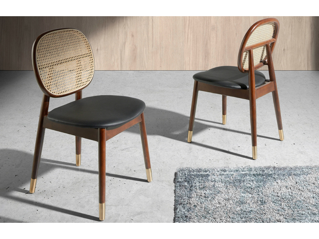 Jídelní židle Angel Cerdá s ořechovým dekorem, černým koženkovým čalouněním a ratanovým výpletem oválného opěradla přináší do vašeho domova teplo a eleganci. Moderní design a kvalitní materiály zaručují maximální pohodlí. Jistě oceníte také efektní detaily ve zlaté oceli a perfektní zpracování pevné jasanové konstrukce. Tento stylový kousek se skvěle hodí nejen do jídelny, ale i do pracovny nebo k toaletnímu stolku. Minimalistický a osobitý design dodá vašemu interiéru jedinečný nádech. Nechte svůj domov zazářit s touto elegantní a funkční židlí.