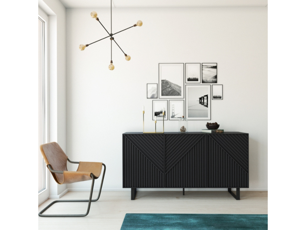 Komoda Peta od značky Marckeric je designovým kouskem, který zaujme svými geometricky frézovanými dvířky a celkově výrazným charakterem. Černý lak na MDF deskách v kombinaci s kovovou podnoží vytváří moderní nábytek s industriálním nádechem. Za třemi uzavíratelnými dvířky se ukrývají police, které nabídnou dostatek prostoru pro elegantní uschování všeho, co nemá být vidět. V kolekci Peta najdete dvě varianty komod a také TV stolek, které společně vytvoří charakter nápaditého a výrazného interiéru.