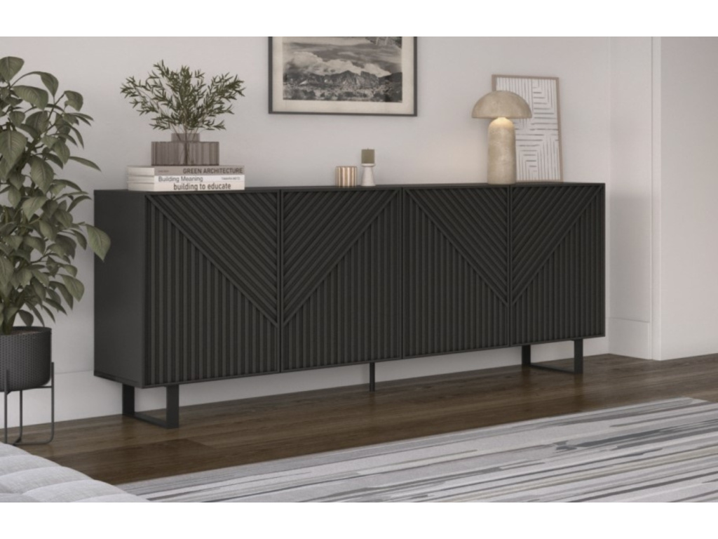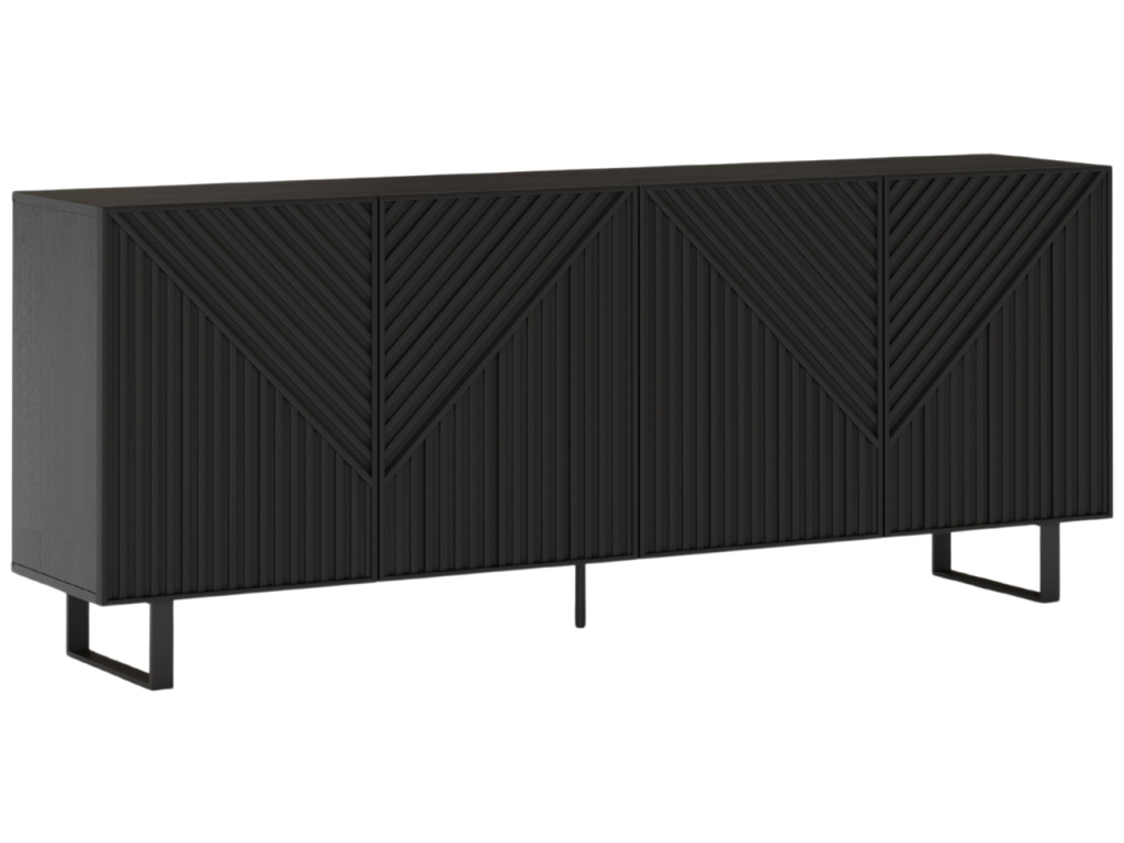 Komoda Peta od značky Marckeric je designovým kouskem, který zaujme svými geometricky frézovanými dvířky a celkově výrazným charakterem. Černý lak na MDF deskách v kombinaci s kovovou podnoží vytváří moderní nábytek s industriálním nádechem. Za čtyřmi uzavíratelnými dvířky se ukrývají police, které nabídnou dostatek prostoru pro elegantní uschování všeho, co nemá být vidět. V kolekci Peta najdete dvě varianty komod a také TV stolek, které společně vytvoří charakter nápaditého a výrazného interiéru.