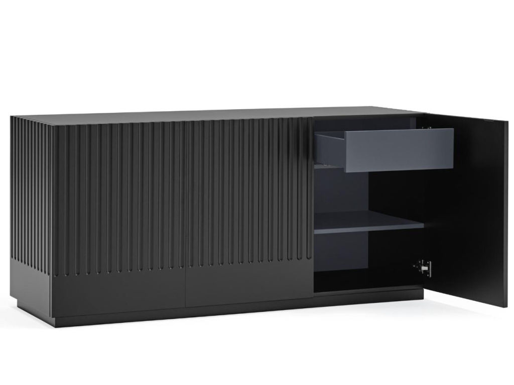 Minimalistická komoda Teulat Doric se díky svému nadčasovému designu stane ideálním doplňkem každého moderního interiéru. Ať už se rozhodnete umístit ji do ložnice či obývacího pokoje, dokonale vám poslouží. Zajímavým designovým prvkem je vzorek na předních dvířkách a po stranách, který nábytku dodává na osobitosti a stylu. Komoda je vyrobena z lakovaného MDF v elegantní černé barvě. Disponuje praktickým úložným prostorem ve formě osmi uzavřených polic a čtyř zásuvek.