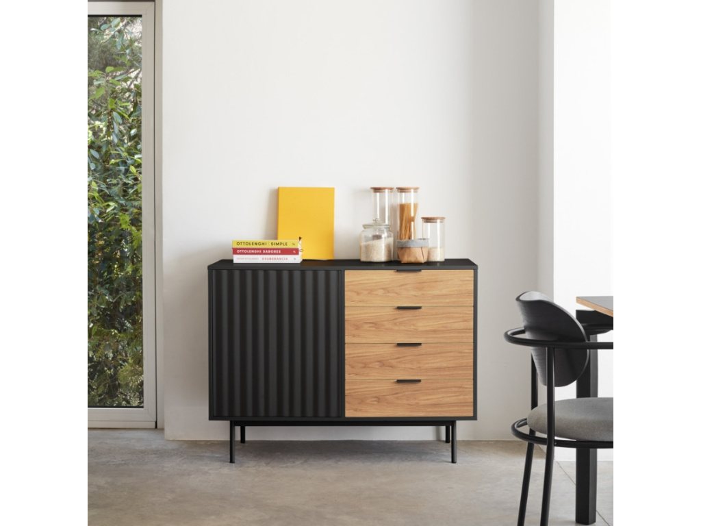 Stylová komoda Teulat Sierra zaujme na první pohled svým minimalistickým designem a harmonikovým vystouplým vzorem na předních dvířkách. Komoda je vyrobena z lakovaného MDF v elegantní černé barvě, která krásně kontrastuje s přední stranou zásuvek z dubové dýhy. Celý korpus doplňuje tenká kovová podnož. Komoda disponuje praktickým úložným prostorem ve formě uzavřených polic a čtyř zásuvek. Komoda Sierra vynikne zejména v moderně laděných interiérech.