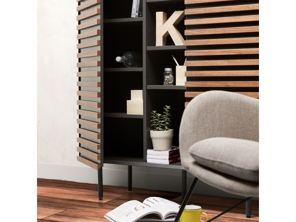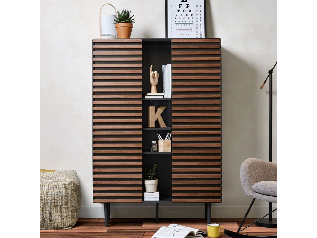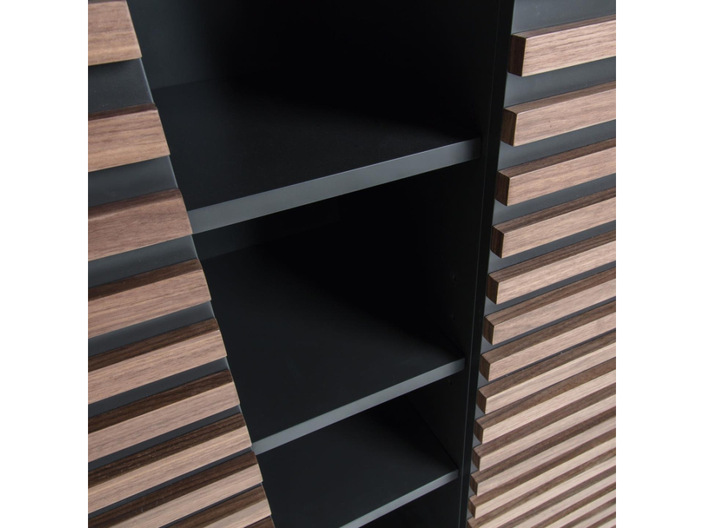 Stylová matně grafitově černá skříň Kave Home Kesia zaujme svým ojedinělým vzhledem. Korpus z lakovaného MDF stojí na pěti kovových nohách a dodává tak celkovou stabilitu a odolnost. Výrazným doplňkem je vystouplý design dvířek, což zajišťuje osobitost a originalitu tohoto kousku nábytku. Kesia se hodí do tmavě zařízených místností s rustikálními, moderními či masivními prvky.