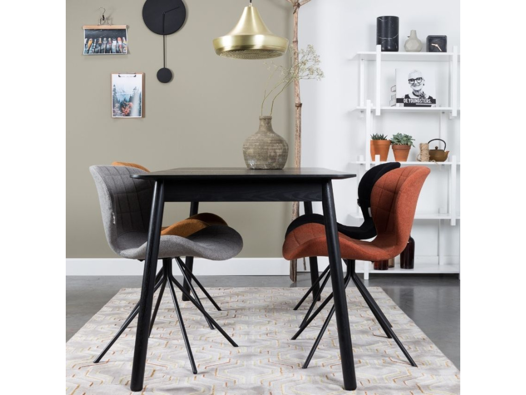 Elegantní a designová čalouněná jídelní židle ZUIVER OMG. Základnu sedáku z kvalitní látky v černé barvě tvoří překližka pokryta tenkou vrstvou pěny, díky které si budete moci vychutnat úžasné pohodlí, a to beze strachu pádu, které Vám zaručí pevná ocelová podnož v elegantním černém provedení.
