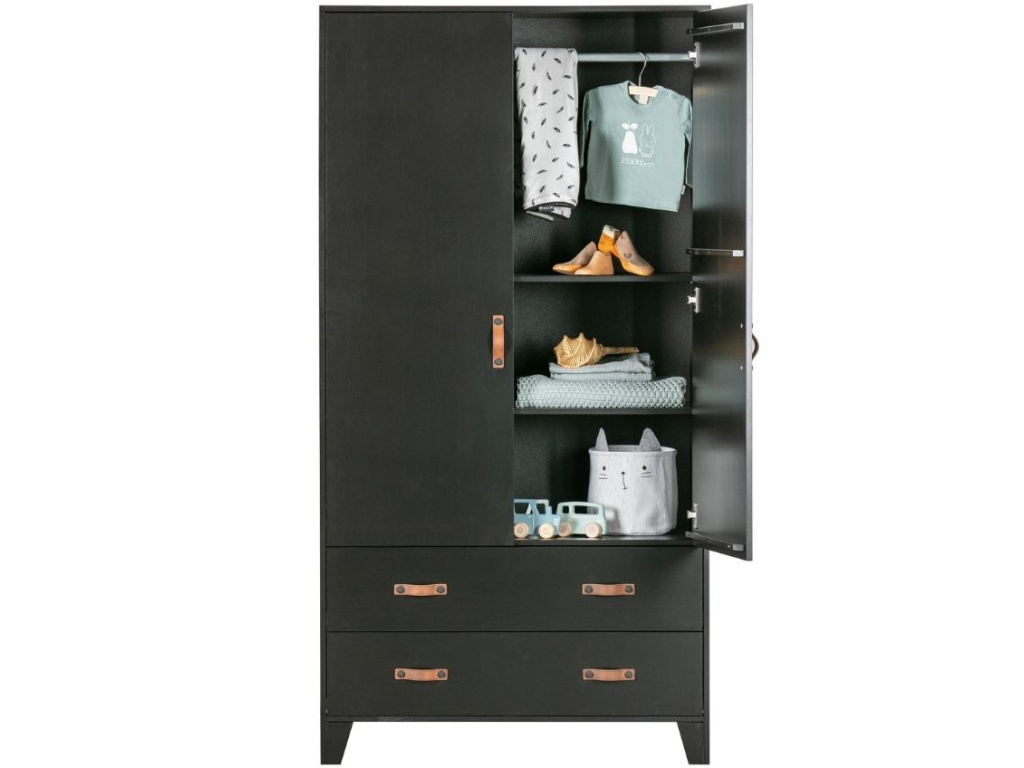 Šatní skříň Rea zaujme svým neotřelým designem. Černé tělo z masivního borovicového dřeva doplňují kožené úchytky hnědé barvy. Použité dřevo získalo certifikaci FSC, protože pochází z šetrně obhospodařovaných lesů. Výroba skříně je tedy šetrná k životnímu prostředí. Na první pohled drsný vzhled je díky modernímu provedení snadno kombinovatelný s různými styly nábytku a zapadne i do vašeho interiéru. Dostatek úložného prostoru poskytují čtyři police a dvě zásuvky. V horní části najdete také praktickou závěsnou tyč.