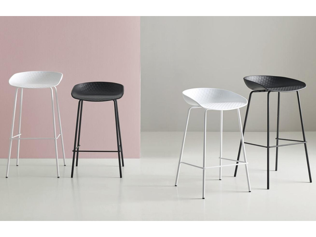 Barová židle Netta s minimalistickým designem je vhodná do každé moderní jídelny, baru nebo pergoly. Její tvarovaný plastový sedák s jemným dekorem dodá vašemu interiéru jedinečný vzhled a lehká konstrukce z lakovaného kovu provzdušní celý prostor.