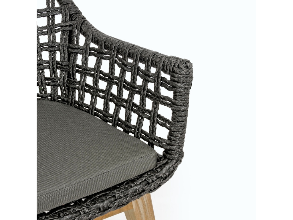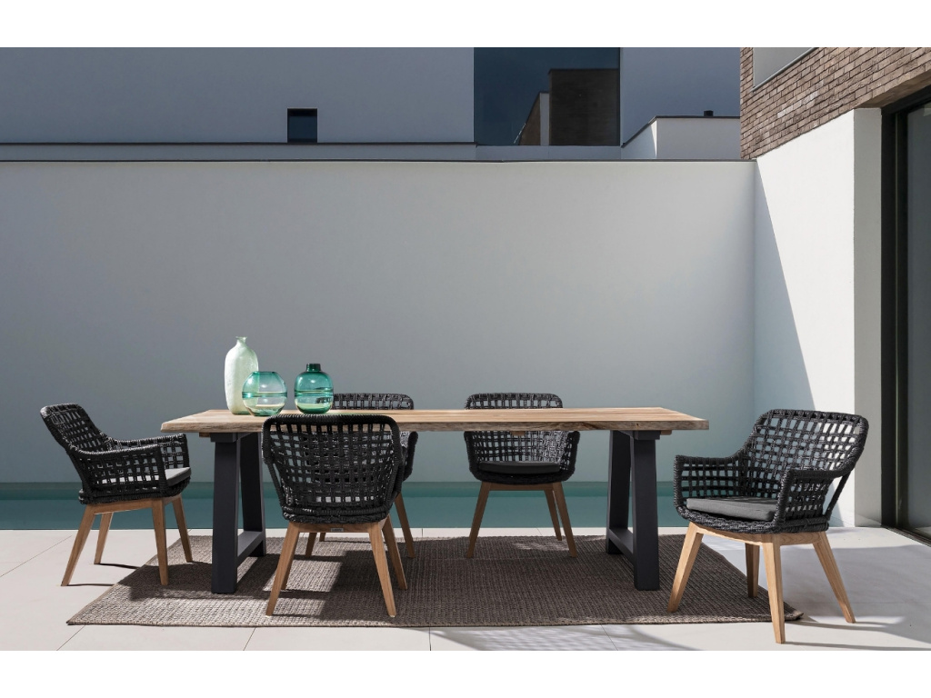 Designovou židli Melisan si zamilujete nejen pro její styl, ale i pro pohodlí, které poskytuje. Konstrukce sedáku je z lakovaného kovu a výplet ze syntetických vláken v černé barvě, propletených do copů. Černý podsedák má praktický odnímatelný látkový potah, který má navíc vysokou odolnost proti slunečnímu záření. Celou židli doplňuje podnož z masivního teakového dřeva. Židli Melisan nejvíce oceníte na balkóně či terase, ale i v zimní zahradě.