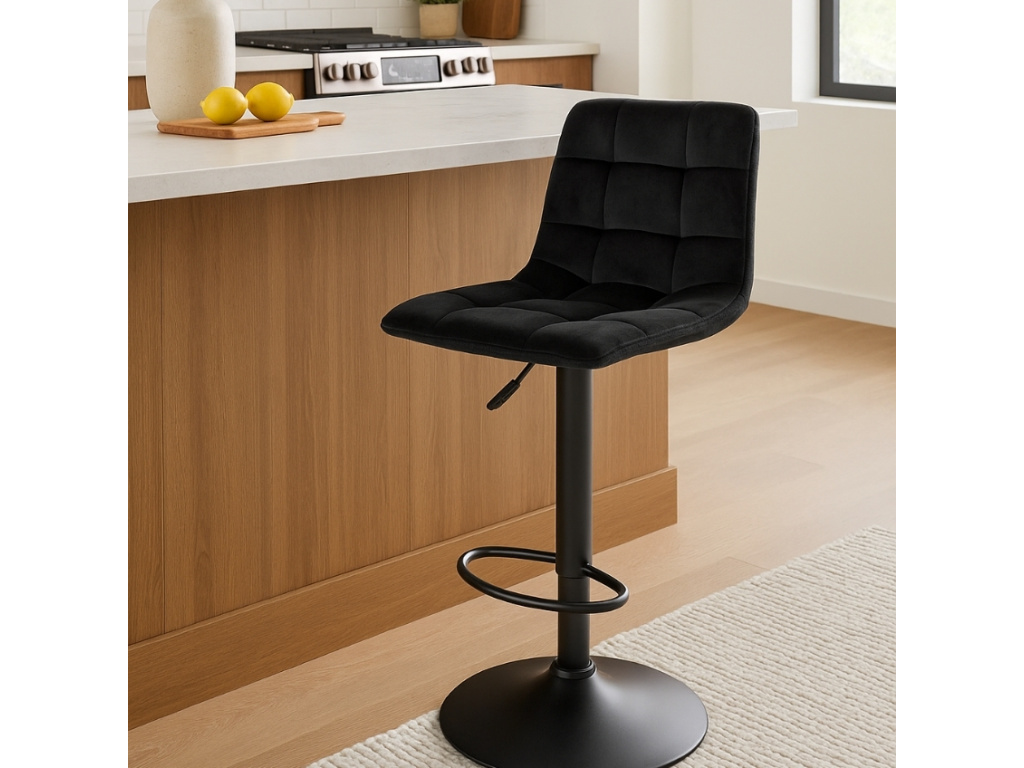 Stylová barová židle Nellie zaplaví interiér svým osobitým a stylovým provedením. Sedák je čalouněný černou sametovou látkou a nabídne jen to nejlepší pohodlí. Celek dotváří elegantní prošívání a kovová podnož, která dodá produktu výraz a postará se o jeho originalitu. Příjemným bonusem je možnost židli výškově nastavit. Židle se skvěle hodí do moderních interiérů.