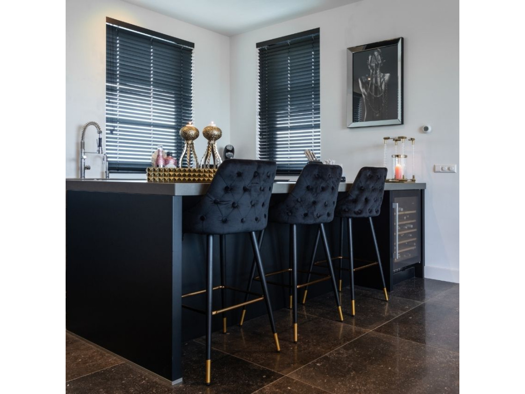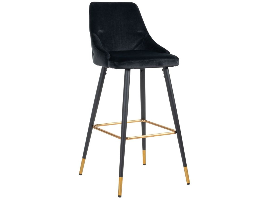 Černá barová židle Imani od značky Richmond Interiors perfektně vyladí moderně zařízené interiéry jídelen i veřejných prostor barů či restaurací. Díky příjemnému měkkému sametovému sedáku si ji okamžitě zamilujete. Sametové čalounění a černo zlatá kovová podnož vytvoří svěží kombinaci v duchu moderních trendů skandinávského stylu.