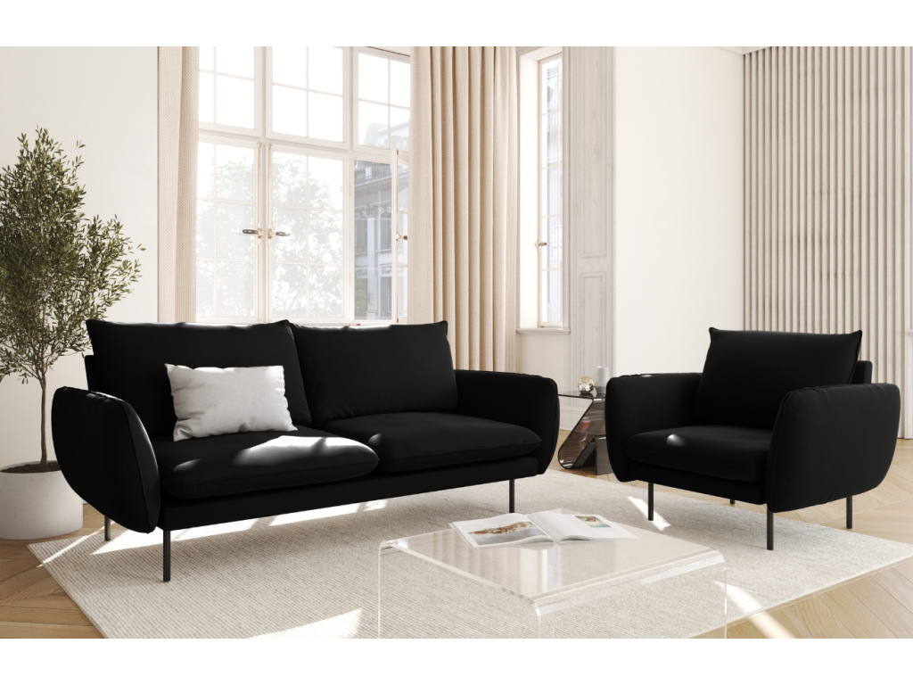 Pohovka Vienna od Cosmopolitan Design je poctou nadčasové eleganci, smyslu pro detail a dokonale vyváženým proporcím. Jemně tvarované opěrky, měkké polštáře a ladná silueta jí propůjčují lehkost, která zaujme na první pohled. Kontrastní černě lakovaná kovová podnož dodává celku vizuální vzdušnost a současně zajišťuje stabilitu. Luxusní sametový potah je nejen krásný na pohled, ale i příjemný na dotek – hladký, hebký a přirozeně elegantní. Na výběr je široká paleta pečlivě vybraných odstínů, které se snadno sladí s jemně minimalistickým interiérem i s odvážnějšími koncepty. Vienna vždy zapadne s lehkostí a zároveň dodá prostoru výraz. A protože každý domov má jiné potřeby, kolekce Vienna je k dispozici v několika velikostech – od kompaktních modelů ideálních do menších bytů až po velkorysé pohovky, na které se vejde celá rodina i s chlupatým parťákem.