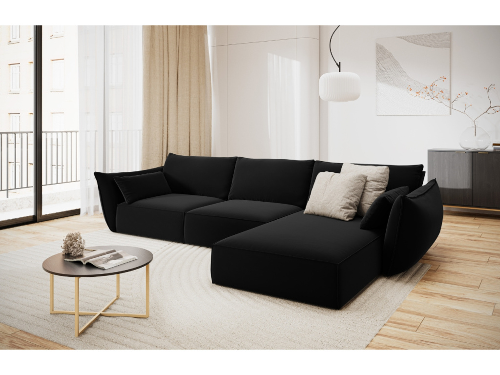 Čtyřmístná rohová pohovka Kaelle od značky Micadoni zaujme elegantním nízkým sezením a tvarovanými područkami, které jí dodávají jedinečný vzhled. Obdélníková silueta s propracovaným lemováním kolem područek a opěradel připomíná tvary polštářů, které poskytují pohodlí a činí pohovku ideálním doplňkem moderního obývacího pokoje. Součástí sezení jsou malé polštářky, které dodává styl i komfort. Celý povrch je čalouněn sametovou tkaninou, která působí čistě a luxusně. Tento model lze navíc snadno kombinovat s dalším nábytkem ze stejné kolekce, která je dostupná jak v žinylkovém, tak v sametovém provedení.
