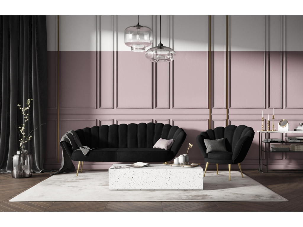 Třímístná pohovka Kingston značky Cosmopolitan Design se vyznačuje jemným prošíváním, které jí dodává elegantní a vzdušný vzhled. Její jemně lesklé sametové čalounění v černém odstínu je hebké a příjemné na dotek. Tkanina je velmi odolná proti oděru a absorpci tekutin, čímž zaručí dlouhodobé používání bez známek opotřebení. Celkový design pohovky doplňuje zlatě lakovaná kovová podnož. Pro dokonale sladěný sedací kout doporučujeme doplnit pohovku o křeslo ze stejnojmenné série. Všechny produkty nabízíme v osmi barevných provedeních. Užijte si pohodlí a styl v jednom!