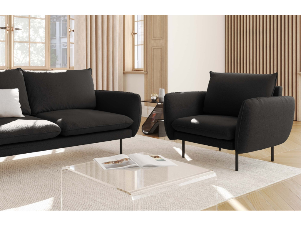 Křeslo Vienna od Cosmopolitan Design je poctou nadčasové eleganci, smyslu pro detail a dokonale vyváženým proporcím. Jeho jemně tvarované opěrky, měkký sedák a ladná silueta mu propůjčují vizuální lehkost, která zaujme na první pohled – a ještě více při posezení. Kontrastní černě lakovaná kovová podnož dodává celku vizuální vzdušnost a současně zajišťuje stabilitu. O vaše pohodlí se postará příjemné bouclé čalounění, které vás doslova pohltí a zaoblené područky vám poskytnou nadměrný komfort při sezení. Na výběr je ze tří pečlivě vybraných odstínů, které se snadno sladí s jemně minimalistickým interiérem i s odvážnějšími koncepty. Vienna vždy zapadne s lehkostí a zároveň dodá prostoru výraz. Skvěle se uplatní jako solitér pro chvíle klidu, stejně jako součást větší sedací sestavy. A právě tu můžete vytvořit s celou kolekcí Vienna, která kromě křesel nabízí také elegantní pohovky a pohodlnou lenošku – ideální pro ty, kteří chtějí styl i komfort dotáhnout do posledního detailu.