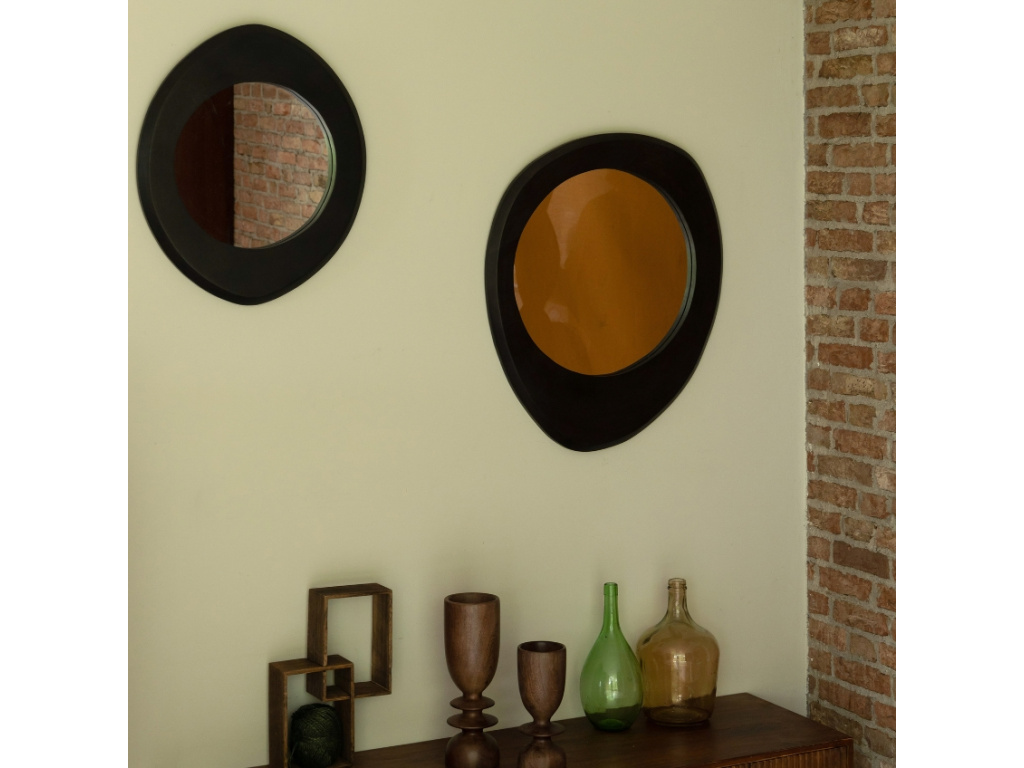 Závěsné zrcadlo DUTCHBONE AREN představuje luxusní propracovaný doplněk, který bude bezpochyby designovým prvkem do vašeho domova. Rám zrcadla je vyrobený z mangového masivu, mořený černou barvou. Ta celému kousku dodává elegantní vzhled a zároveň zanechává jedinečnou strukturu mangového dřeva. Nepravidelný organický tvar zrcadla dodá celému interiéru svěží nádech. AREN bude perfektní volbou, až už jako samostatná dekorace nebo spolu s dalšími zrcadly ze stejnojmenné kolekce.