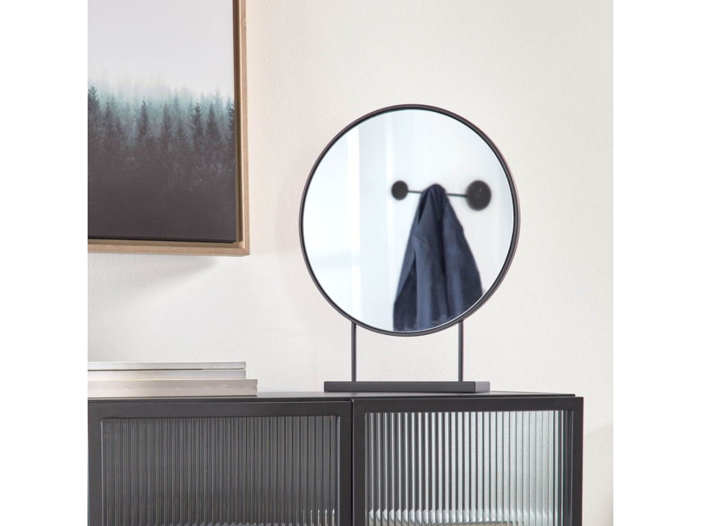 Stolní kosmetické zrcadlo Kave Home Libia bude praktickým i stylovým doplňkem vašeho interiéru. Rám zrcadla je tvořen černě lakovaným kovem a zrcadlo je usazené na lakované MDF základně. Nemusí být používáno jen na toaletním stolku, bude krásným doplňkem také v chodbě, předsíni nebo na komodě v ložnici.