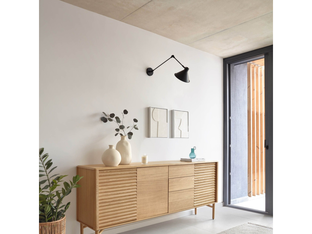 Stylové nástěnné světlo Kave Home Dione zaujme svým unikátním designem. Černě lakovaná kovová konstrukce dodává světlu na originalitě a šarmu. Dione se skvěle hodí do moderních interiérů. Umístit ho můžete například do obývacího pokoje nad pohovku nebo do ložnice nad noční stolek.