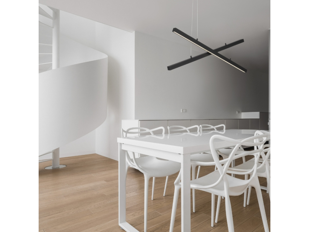 Královnu mezi minimalistickými svítidly představuje závěsné světlo X-line od značky Nova Luce. To tvoří dva černě lakované kovové panely, zavěšené do tvaru písmene X. Jejich výšku zavěšení lze polohovat dle libosti a třeba tak umístit panely do jedné roviny. To vám dává prostor experimentovat s různými úhly a najít pro vás ten nejvhodnější tvar. Světlo se stane dominantním prvkem ve vaší domácnosti, ať už bude osvětlovat jídelní stůl nebo pohovku.