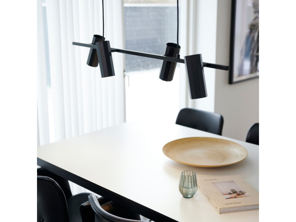 Precizní geometrie a jemná elegance – Alanis je mistrovské dílo minimalistického designu. Čtyři otočná stínidla umožňují směrování světla podle potřeby, což jej činí ideálním prvkem nad jídelní stůl nebo pracovní plochu. Kombinace černého kovu a jednoduchých linií působí lehce industriálně, ale zároveň velmi sofistikovaně. Navrženo dánským studiem Says Who pro interiéry, které si zakládají na funkční estetice.