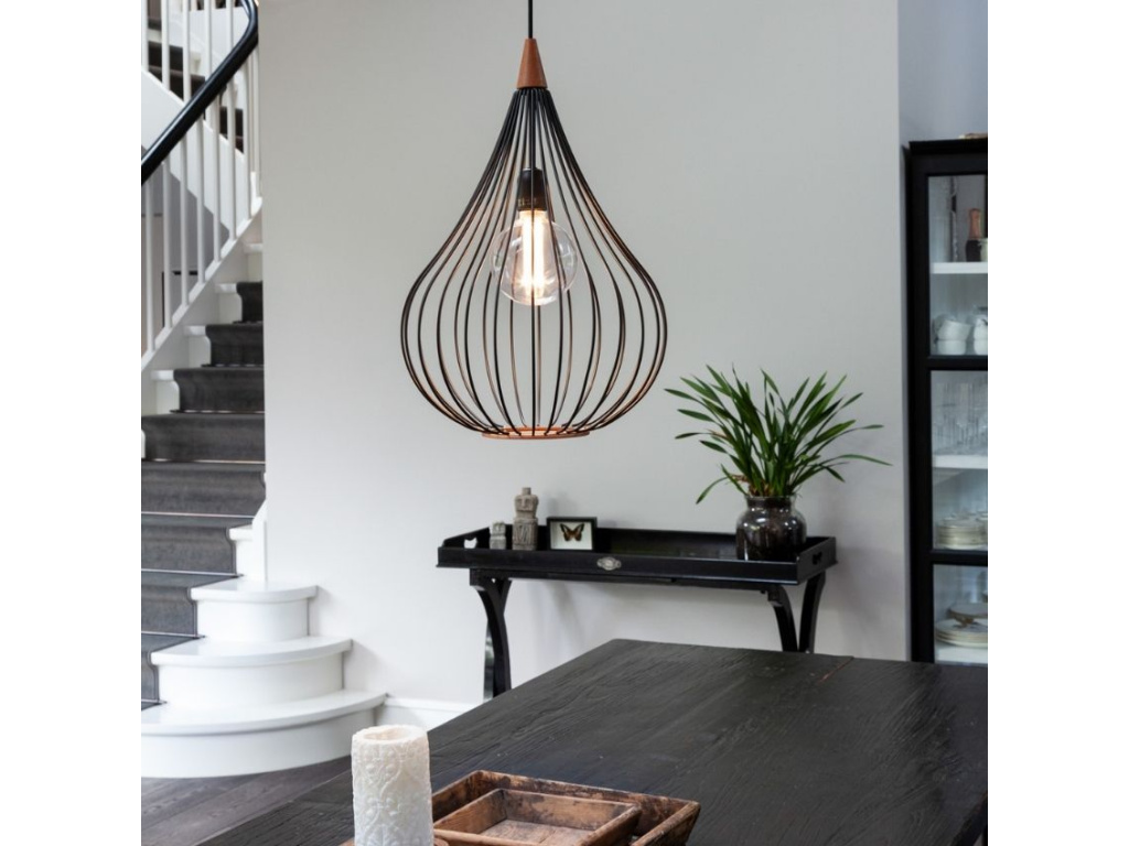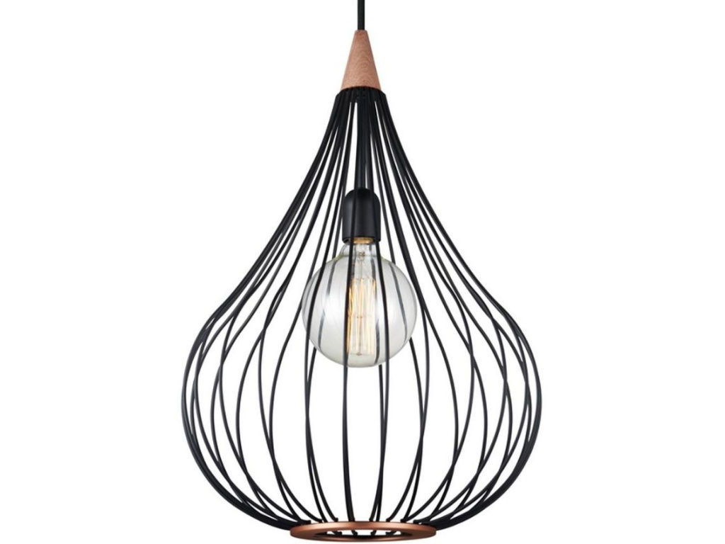 Elegantní závěsné světlo Drops značky Halo Design zaručeně zútulní každý interiér. Černé stínidlo si získá vaši pozornost především svým tvarem - připomíná velkou kapku. Je tvořeno jemnou sítí tyček z černě lakovaného kovu a ozvláštňují ho zajímavé dřevěné detaily. Právě spojení chladného kovu a přírodního detailu z něj dělá originální designový kousek. Drops můžete zakoupit ve čtyřech velikostech. K dispozici jé také v opálově bílém provedení se skleněným stínidlem.