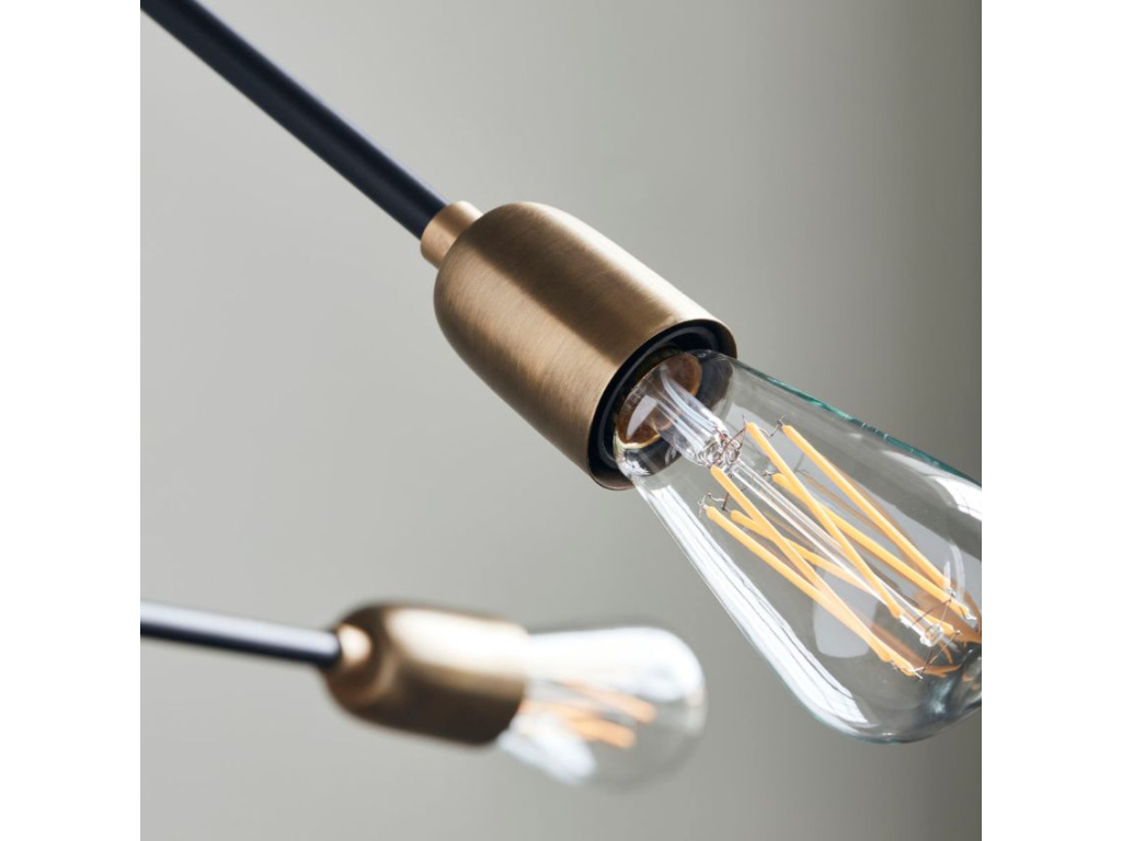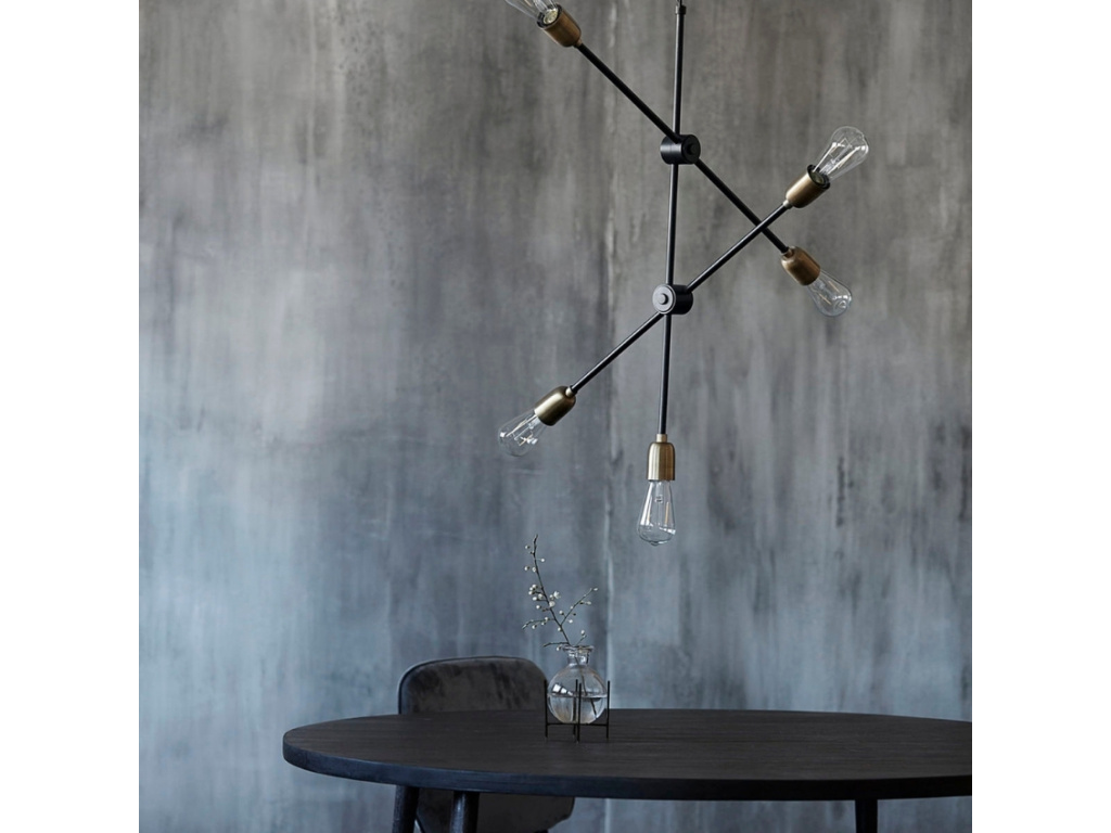 Jedinečné a originální světlo Molecular bude skvělým designovým doplňkem vašeho interiéru. Na černě lakované, nastavitelné, kovové tyči je rozmístěno celkem pět mosazně lakovaných objímek na žárovku. Kombinace černé a mosazně zlaté barvy působí velmi stylově. Žárovka není součástí balení.