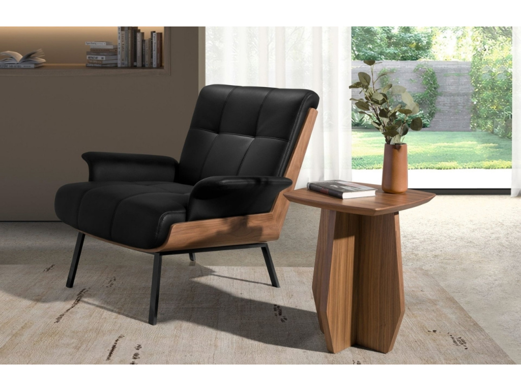 Minimalismus v kombinaci s přírodními materiály – přesně tím zaujme toto křeslo. Černé koženkové čalounění je nejen odolné a snadno udržovatelné, ale také vizuálně podtrhne moderní charakter místnosti. Jemné dřevěné detaily v přírodním ořechovém odstínu dodají na útulnosti a propojí křeslo s ostatními prvky interiéru. Měkce polstrovaný sedák a ergonomicky tvarované opěradlo nabídnou maximální komfort i při delším sezení. Černá kovová podnož pak dodá a dotvoří jeho stabilní elegantní vzhled. Skvěle zapadne do industriálních i moderně laděných interiérů.