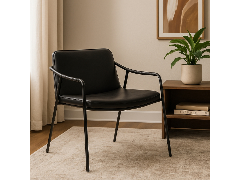 Designové křeslo DAN-FORM Boto vás zaujme hned na první pohled svým lehkým nádechem retro stylu. Tenká, černě lakovaná podnož minimalisticky navazuje na područky. Sedák je vyrobený ze stylové ekokůže v černé barvě, stejně jako opěrka zad. Stylovým bonusem je širší pruh stejného materiálu omotaný kolem područek.