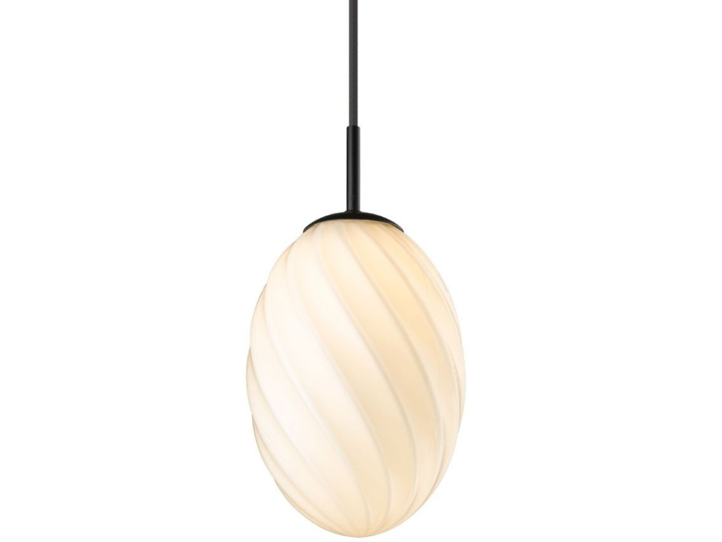 Závěsné světlo Twist značky Halo Design získalo název podle zvlněné struktury, kterou je ozdobeno jeho skleněné stínidlo. Světlo přiláká vaši pozornost nejen originálním stínidlem, ale také spojením černé a opálově bílé barvy, které vnese do interiéru nádech elegance a luxusu. Dostupné je také v kulatém provedení. Vybrat si můžete ze dvou velikostí a dvou barevných variant kovového zavěšení.