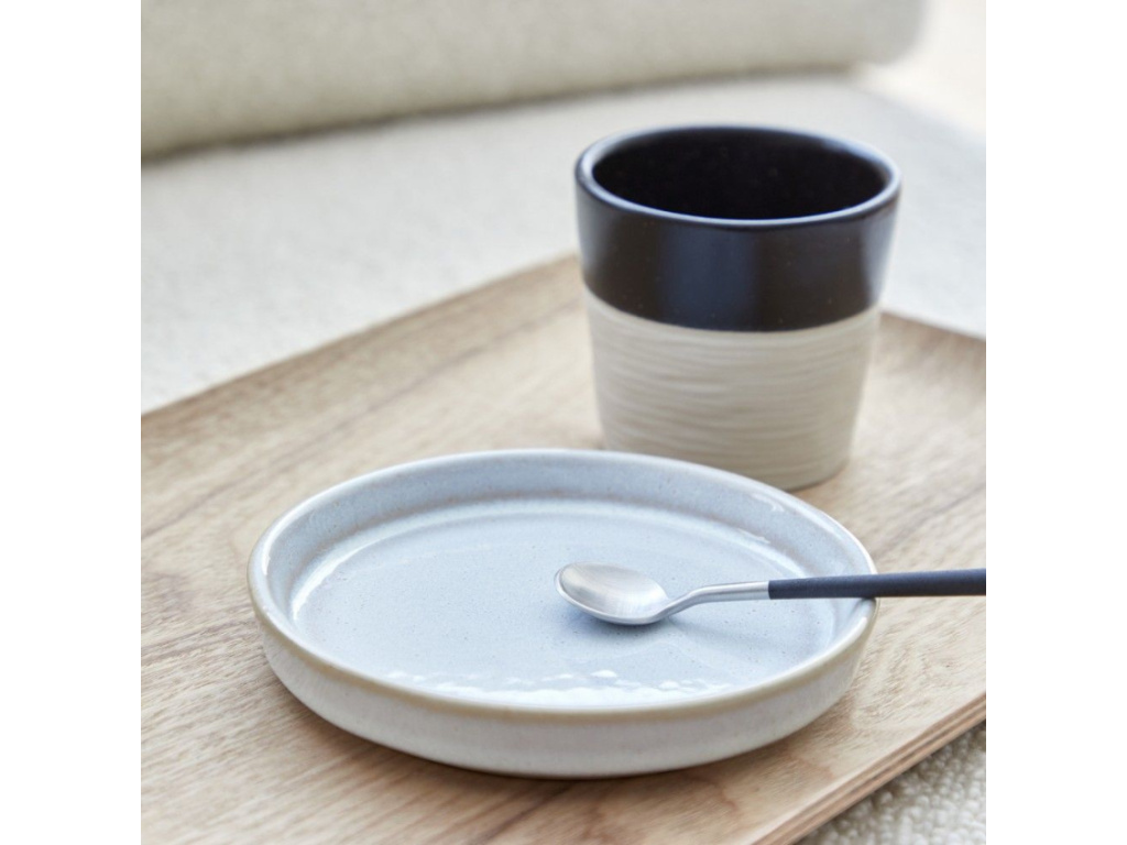 Kameninový hrnek v přírodním stylu vás zaujme na první pohled. Jednoduchý moderní tvar je zvýrazněn barevným předělem, ale také rozdílnou strukturou. Matná černá glazura v horní části hrnečku kontrastuje s krémovou vroubkovanou spodní částí. Díky tomu se hrneček nejen skvěle drží a zajistí vám nevšední chuťový i hmatový požitek z vašeho nápoje. Hrnek je ideální pro podávání kávy či čaje.