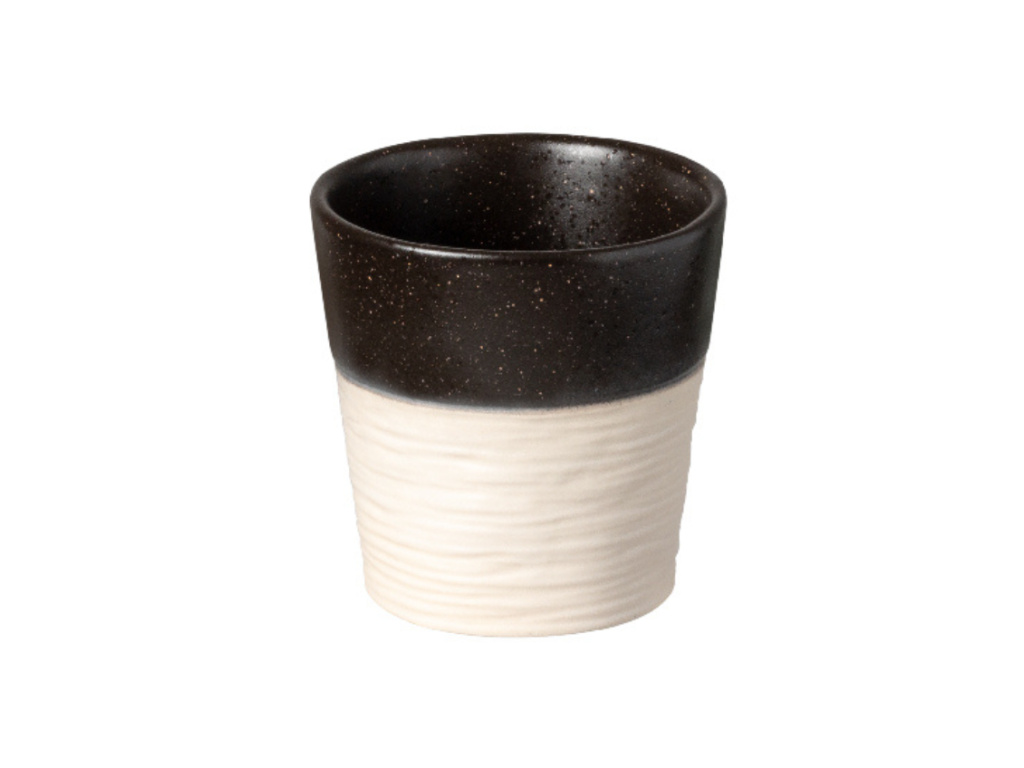Kameninový hrnek v přírodním stylu vás zaujme na první pohled. Jednoduchý moderní tvar je zvýrazněn barevným předělem, ale také rozdílnou strukturou. Matná černá glazura v horní části hrnečku kontrastuje s krémovou vroubkovanou spodní částí. Díky tomu se hrneček nejen skvěle drží a zajistí vám nevšední chuťový i hmatový požitek z vašeho nápoje. Hrnek je ideální pro podávání kávy či čaje.