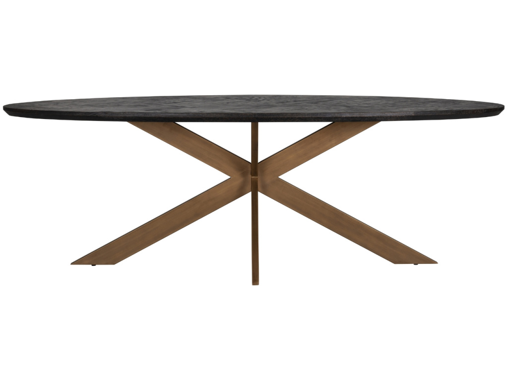 Jídelní stůl Blackbone od značky Richmond se vyznačuje svým robustním a přesto elegantním designem. Oválná deska z dubové dýhy mořené do černé barvy, jejíž části jsou seskládané do takzvané rybí kostry. Stůl se stane perfektním prvkem v rustikálních, moderních a industriálních jídelnách. Dominantním prvkem celého designu stolu je mosazná podnož hvězdicovitého tvaru. Doplňte stůl o další produkty z kolekce Blackbone, sjednoťte nábytek ve svém interiéru a vyneste celý prostor o level výš.