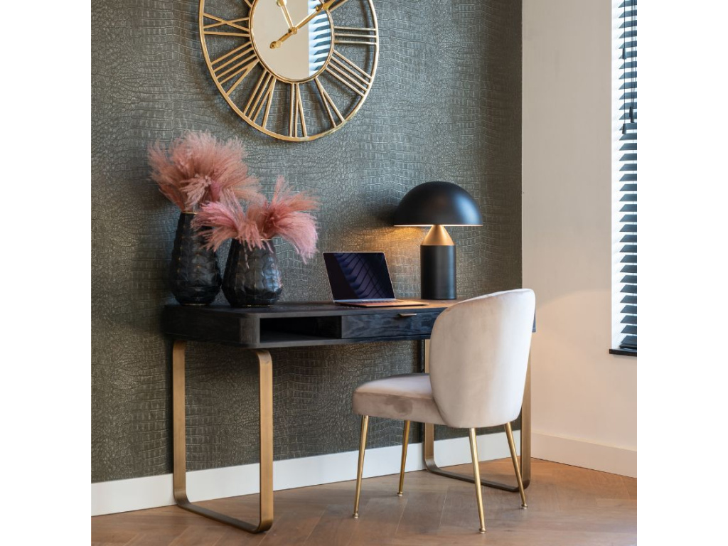 Pracovní stůl Blackbone značky Richmond s deskou z dubové dýhy nabízí úložný prostor v podobě jedné zásuvky a dvou otevřených polic. Podnož stolku je tvořena dvěma širokými kovovými nohami, které zaujmou svým starožitným měděným odstínem. Stůl můžete v interiéru doplnit dalšími produkty ze stejnojmenné série.