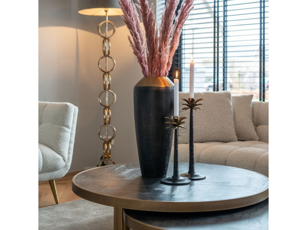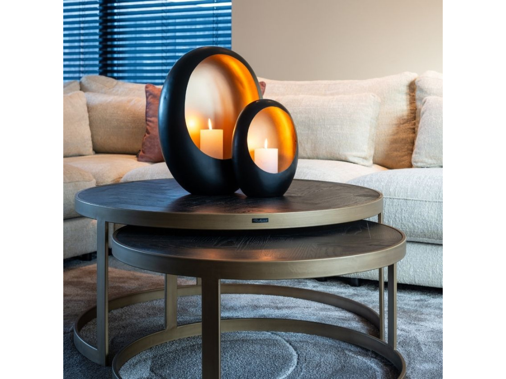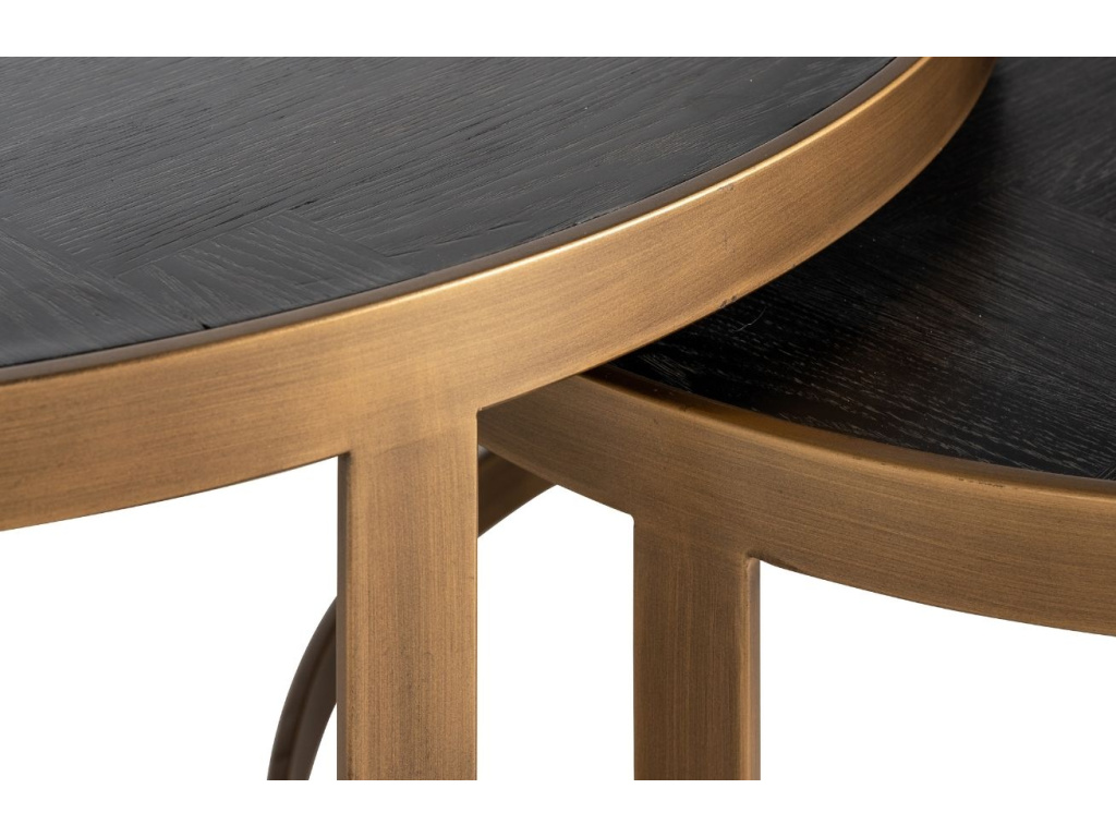 Set dvou konferenčních stolků Blackbone od značky Richmond Interiors si zamilujete díky elegantnímu zpracování. Černá dubová deska a mosazná podnož vytváří atraktivní kombinaci, díky níž stolky získávají na šarmu a osobitosti. Stolky k sobě nejsou připevněné, můžete je tak umístit do různých částí vašeho interiéru. Vyniknou v klasických i moderních prostorech.
