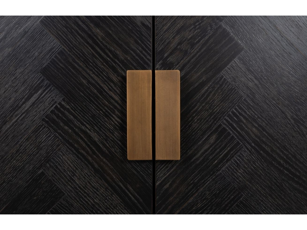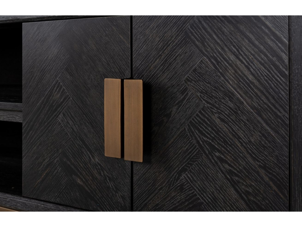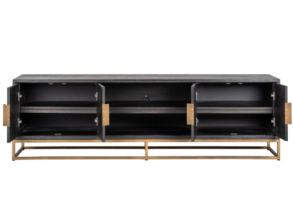 Černý dubový TV stolek Blackbone od značky Richmond Interiors zaujme svým osobitým zpracováním a kombinací materiálů. Korpus stolku je vyroben z dubového dřeva, kovová podnož je měděně zbarvená. Atraktivitu nábytku zvyšuje úložný prostor se dvěma otevřenými a čtyřmi zavřenými policemi. Díky čistému provedení a stylovému designu se stolek Blackbone stane dominantou vašeho interiéru.