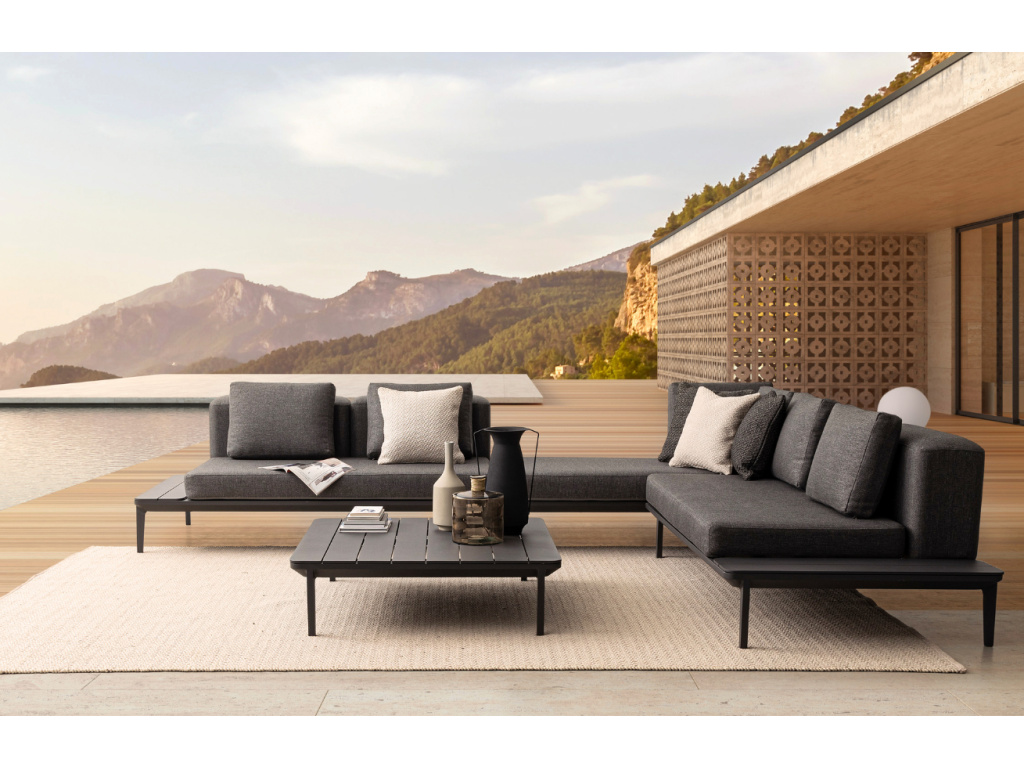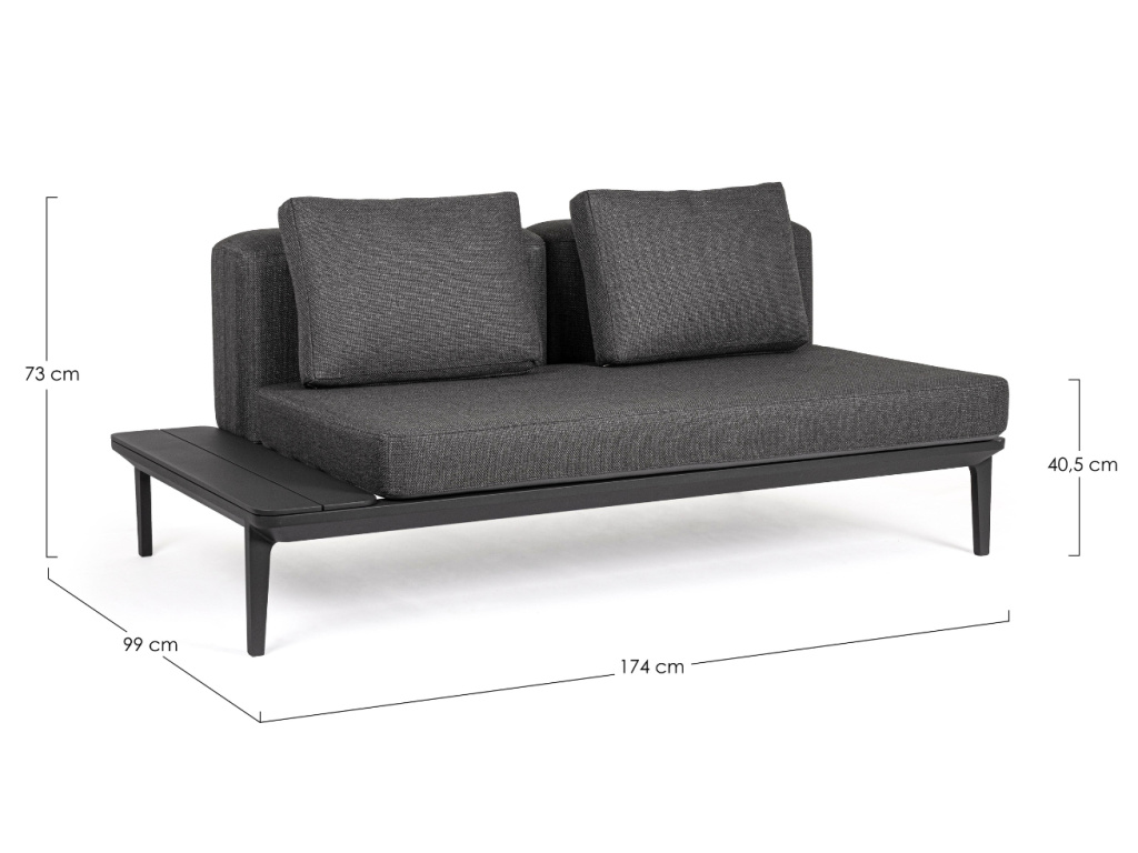 Zahradní dvoumístná pohovka Bizzotto Matrix je krásným, moderním kouskem, který využijete ať už na své terase nebo ideálně v japandi laděném interiéru. Podnož je z černého lakovaného hliníku s neodnímatelnou čalouněnou zádovou opěrkou. Stylovým a současně praktickým nápadem je odkládací plocha, která je variabilní pro svého majitele. Pohovka lze totiž nastavit na obě strany, anebo z ní lze vytvořit lenošku. Sedák s polštáři je z olefinové látky, která je rezistentní vůči vodě a UV záření. Nechte se unést variabilitou a vytvořte si tak krásný a pohodlný sedací prostor pro váš odpočinek.