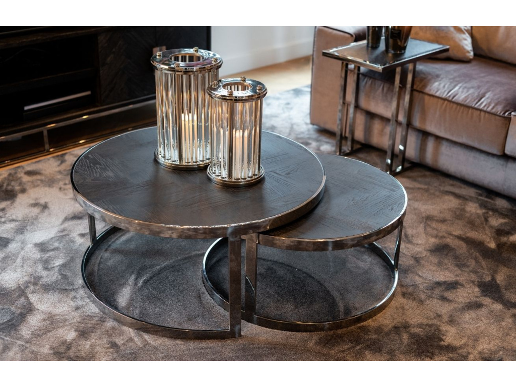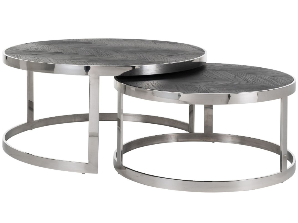 Set dvou konferenčních stolků Blackbone od značky Richmond Interiors si zamilujete díky elegantnímu zpracování. Černá dubová deska a stříbrná podnož vytváří atraktivní kombinaci, díky níž stolky získávají na šarmu a osobitosti. Stolky k sobě nejsou připevněné, můžete je tak umístit do různých částí vašeho interiéru. Vyniknou v klasických i moderních prostorech.