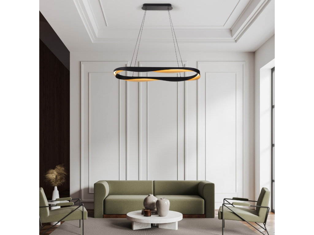 Doplňte svůj interiér tento luxusní kousek v podobě závěsného LED světla Radon od Nova Luce! Radon vás okouzlí svými organickými křivkami a kombinací černých a zlatých odstínů, které spolu vytváří dokonalou souhru barev. Světlo Radon u nás najdete jako závěsné i stropní svítidlo. Je stmívatelné, proto si intenzitu světla nastavíte přesně dle svých potřeb a přání. Perfektně vynikne v moderních prostorech, kde mu to bude slušet například nad jídelním stolem či uprostřed obývacího pokoje.