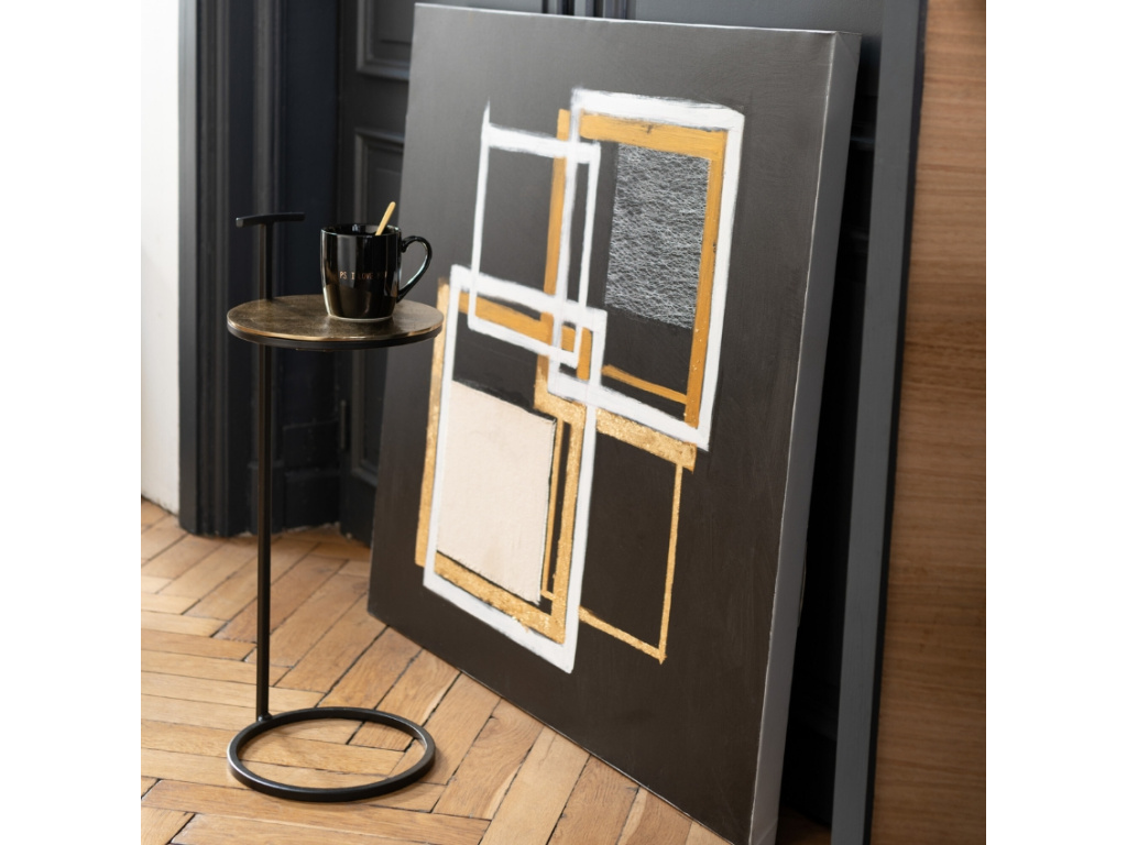 Odkládací stolek Tinoli disponuje praktickou rukojetí, díky které ho můžete v interiéru snadno přesouvat. Zlatě lakovaná kovová deska vytváří společně s černou podnoží atraktivní kontrast, který ozvláštní váš interiér a vnese do něj nádech elegance. Vedle pohovky nebo křesla na něj odložíte hrneček s kávou a v předsíni ho můžete využívat k odložení klíčů nebo peněženky. Stolek nabízíme i v další barvě!