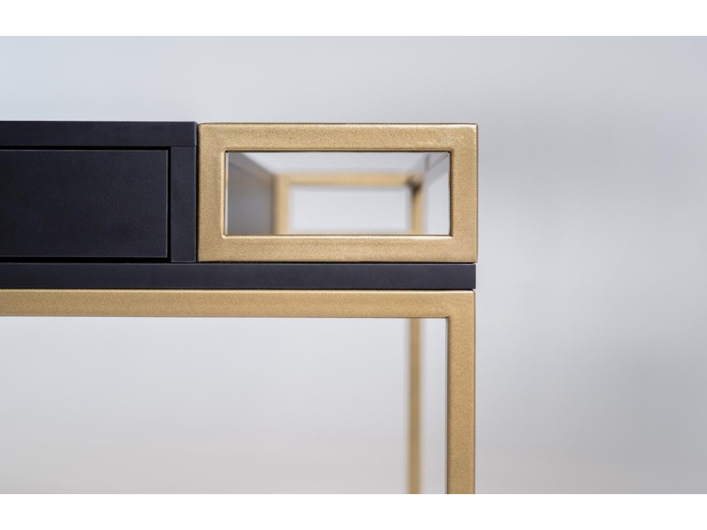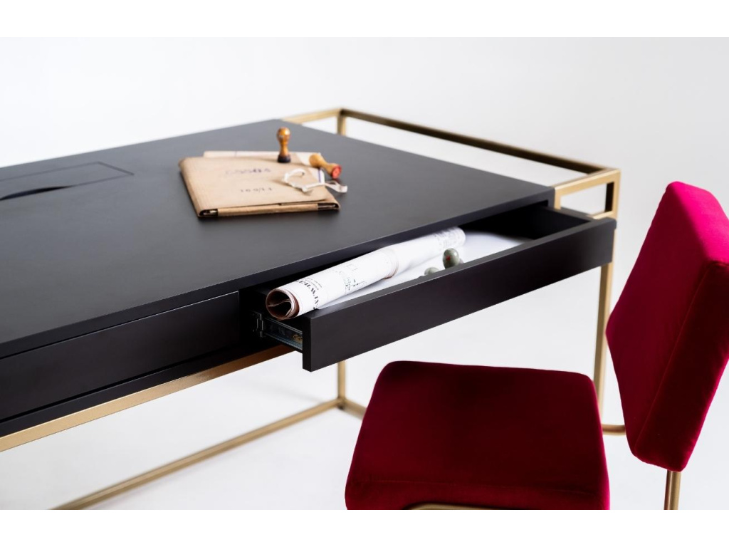 Kancelářský stůl Hugo je ideální volbou pro moderní a minimalistické kanceláře či domácí pracovny. Černě lakovaná laminátová deska vytváří společně se zlatě lakovanou kovovou podnoží atraktivní kontrast, který zaujme. Příjemným bonusem je úložný prostor ve formě 2 zásuvek a 2 bočních polic, kam pohodlně uložíte veškerý váš inventář. Pracovní stůl Hugo se skvěle hodí do moderních interiérů.