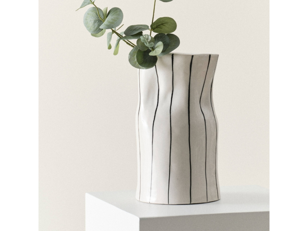 Váza MOJ okouzlí na první pohled – svým jemně nepravidelným tvarem, ručně malovanými pruhy i lesklou glazurou, která zvýrazňuje každý detail. Každý kus je originál s duší řemesla a jedinečnou kresbou. Keramické tělo s úzkými černými pruhy působí jako moderní umění, které však neztrácí na hřejivosti. MOJ si skvěle rozumí s minimalistickým i bohémským interiérem – ať už ji necháte vyniknout samostatně, nebo ji doplníte o sušené, umělé či čerstvé květiny.