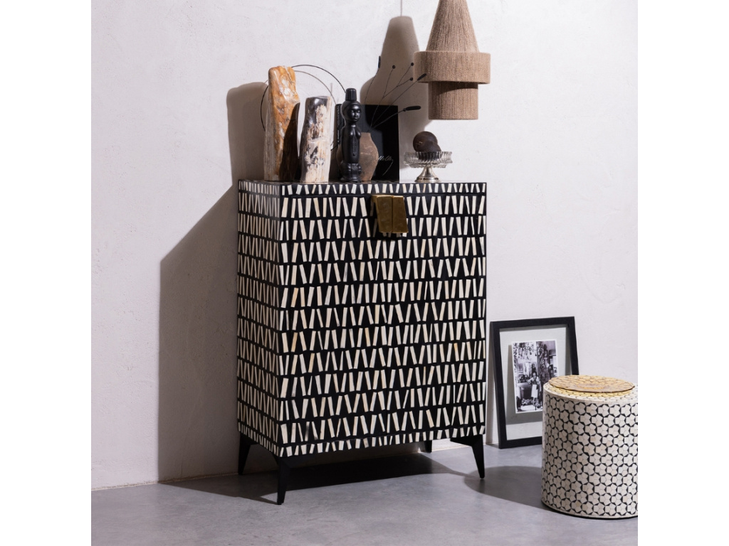 Pokud toužíte po ozvláštnění vašeho interiéru, vzorovaná komoda Maia z mangového dřeva je tím pravým. Je vytvořena pomocí dekorační techniky Bone inlay, při které se používají detailně zpracované kosti, které jsou zality pryskyřicí. Nejen, že přinese do vašeho domova nádech exotiky a luxusu, ale disponuje také dostatkem úložných prostor. Její tři velkorysé uzavřené police vám umožní uložení a organizaci různých dokumentů či jiného inventáře. Jednoduchá kovová podnož a úchytky ve zlaté barvě pouze umocní její moderní vzhled. Komoda Maia se jednoznačně stane středem pozornosti ať už v obývacím pokoji, nebo v ložnici či kanceláři.