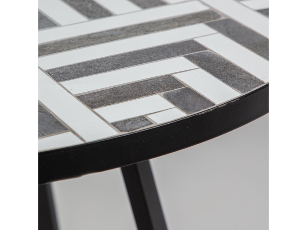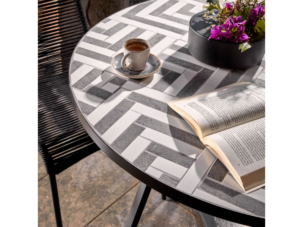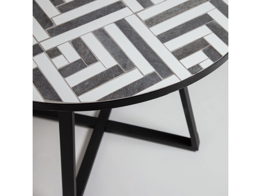 Keramický zahradní stůl Kave Home Tella zaujme na první pohled svou černobílou asymetrickou mozaikou geometrických tvarů. Každý kousek mozaiky byl na své místo ručně položen, takže je každý stůl originální a jedinečný. Kamenná deska a kovová podnož vytváří atraktivní prvek, který dodá do vašeho interiéru i exteriéru osobitost a styl.