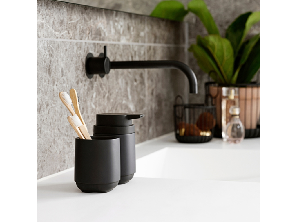 Praktický stojan na zubní kartáčky Time od dánské značky Zone Denmark vám pomůže udržet vaše umyvadlo hezky uspořádané. Díky minimalistickému vzhledu nemusíte stylový betonový kelímek na umyvadlo využít jen jako držák na zubní kartáčky a pastu, ale pomůže vám také s organizací doplňků pro líčení či hřebenů. Neutrální černý betonový odstín se snadno kombinuje a hodí se k tmavším i světlejším koupelnám.