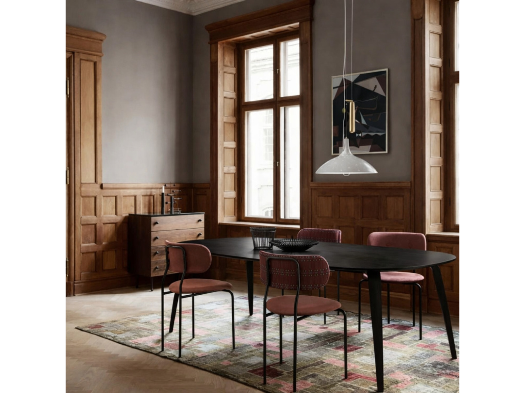 Jídelní stůl GUBI představuje elegantní a nadčasové řešení pro každý interiér. Dánské studio Komplot Design zkombinovalo skandinávský minimalismus s jemnými organickými liniemi, které vytvářejí útulnou a přívětivou atmosféru při každém stolování. Tento stůl je nejen estetickým, ale i funkčním prvkem – poskytuje dostatek místa pro pohodlné stolování a stane se centrem každé moderní jídelny. Je dostupný ve třech elegantních variantách povrchové úpravy – dub, americký ořech a výrazný černě mořený jasan. Každá z těchto verzí je navržena tak, aby ladila s různými styly interiérů, od skandinávských až po industriální. Pevná konstrukce z kvalitní dýhy a masivního dřeva zajišťuje stabilitu i dlouhou životnost.