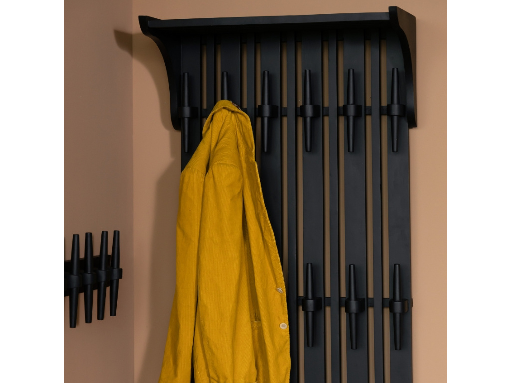 Nástěnný věšák DUTCHBONE JAKUB pochází ze série produktů, díky kterým může být vaše chodba či předsíň dokonale sladěna v jednotném designu. Věšák disponuje kromě 12 věšáků také praktickou policí, kterou využijete třeba k odložení čepic, šál, šátků i rukavic. Věšák je vyrobený z mangového dřeva, které je opatřeno matně černým lakem. Oblečte vaši předsíň do nového se sérií masivního nábytku Jakub!
