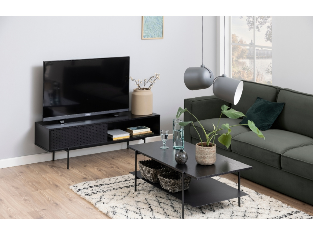 Černý televizní stolek Toren se stane nejen designovým ale i praktickým prvkem vašeho interiéru. Posuvná dvířka s designovým děrováním si můžete prakticky nastavit dle vlastní potřeby a využít tak polici stolku přesně tak, jak vám bude vyhovovat. TV stolek Toren nejlépe doplníte dalším nábytkem ze stejnojmenné série a doladíte tak svůj interiér o designové kousky.