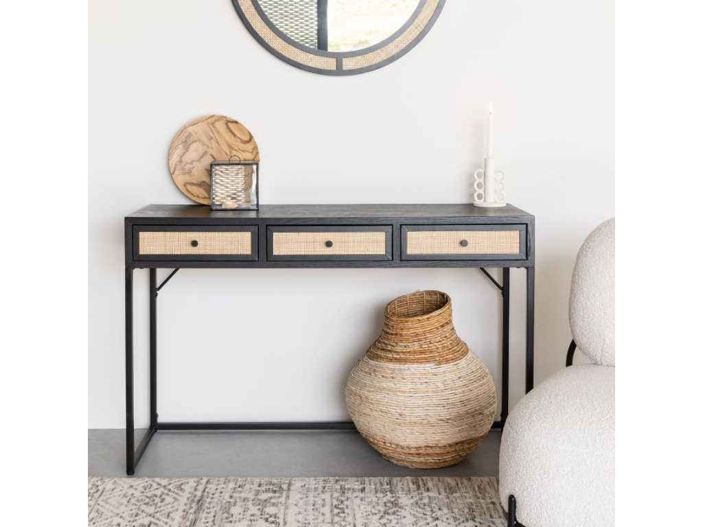 Toaletní stolek Guuji s sebou do přináší úložný prostor v podobě tří zásuvek. Ty jsou ozvláštněny ratanovým výpletem, který stolku dodává na zajímavosti. Umístit jej můžete kamkoliv, kde potřebujete prostor pro vystavení dekorací. Využit může být také jako místo k tvůrčímu psaní, nebo se u něj můžete líčit.