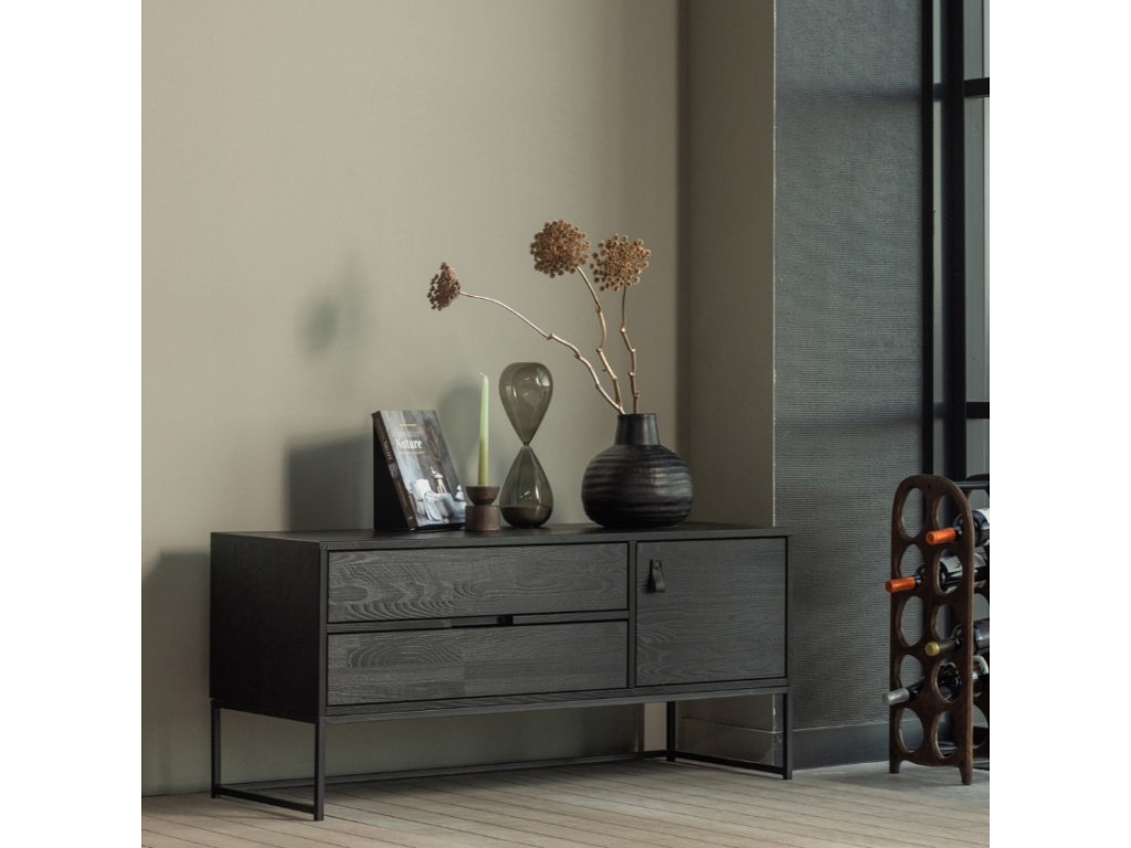 Elegantní TV stolek Sinai od značky Hoorns nabízí praktický úložný prostor v podobě dvou uzavřených polic s dvířky a dvou širokých zásuvek. Korpus je vyroben z masivního borovicového dřeva s certifikací FSC lakovaného černou barvou a jeho moderní design je podtržen matně černou lakovanou podnoží z kovu. Dvířka skříňky navíc mají velice hezký detail v podobě kožené úchytky. Sinai můžete využívat nejen jako televizní stolek, ale i jako úložnou komodu v pracovně nebo v ložnici, kde na horní desku naaranžujete dekorace, a tím tak opticky vyplníte prázdný prostor. TV stolek skvěle doplní další produkty ze stejné série Sinai.