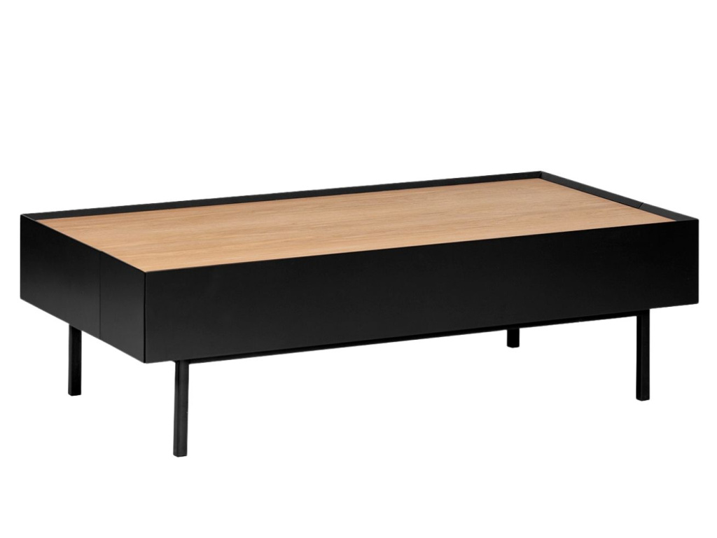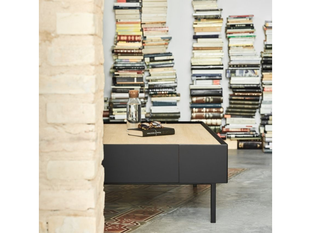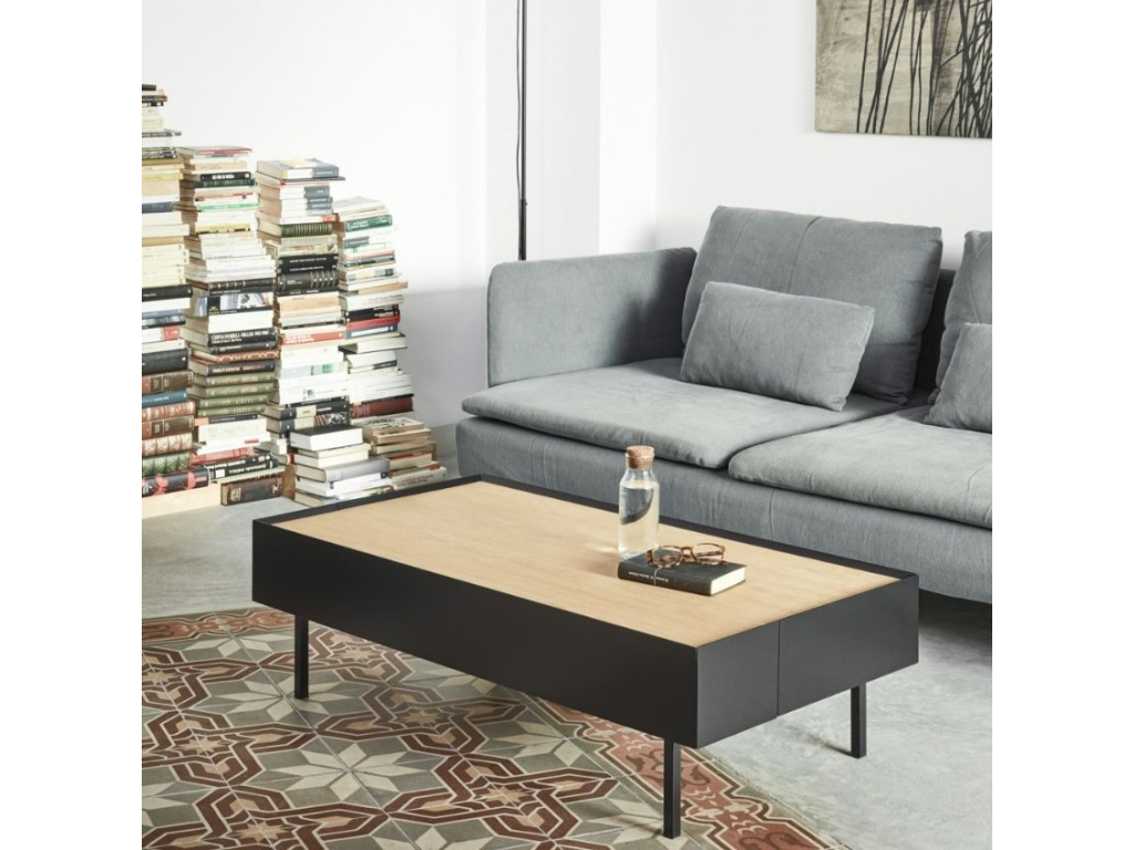Konferenční stolek Teulat Arista bude stylovou ozdobou každého obývacího pokoje. Dominantní černá barva podtrhuje minimalistický design stolku, se kterým kontrastuje vrchní deska s dubovou dýhou v přírodním odstínu. U stolku vás potěší i úložný prostor v podobě výsuvných zásuvek, což vám bude ulehčovat organizaci a úklid vašeho inventáře. Moderní styl stolku podtrhuje tenká lakovaná kovová podnož, která barevně ladí se zbytkem stolku.