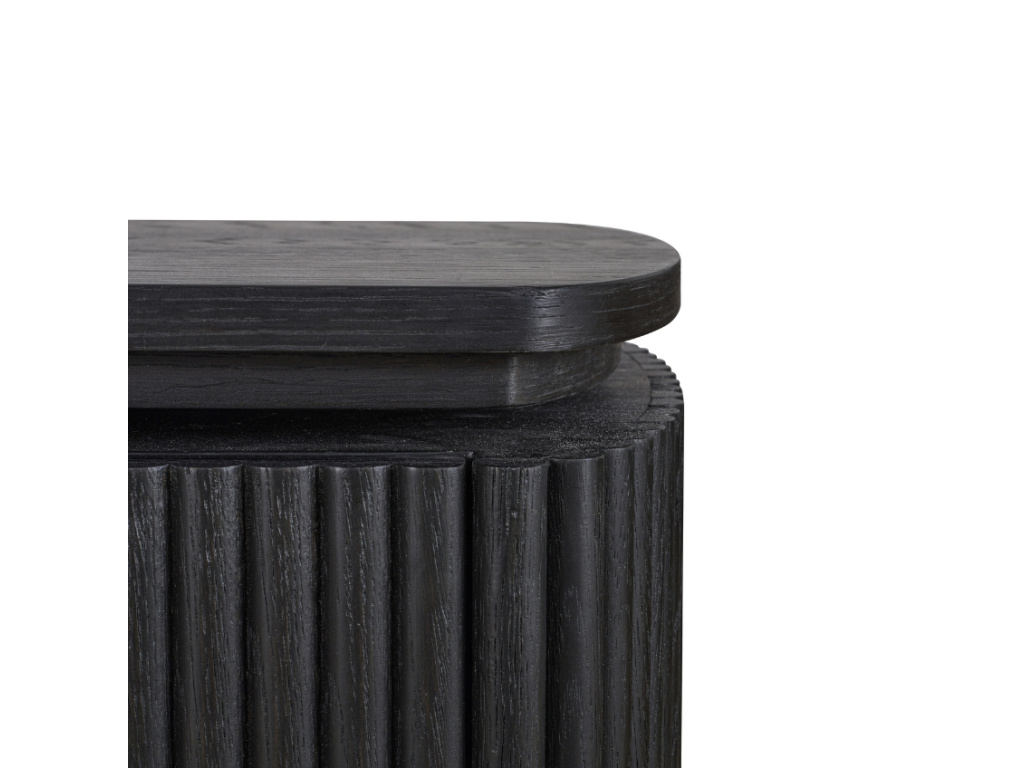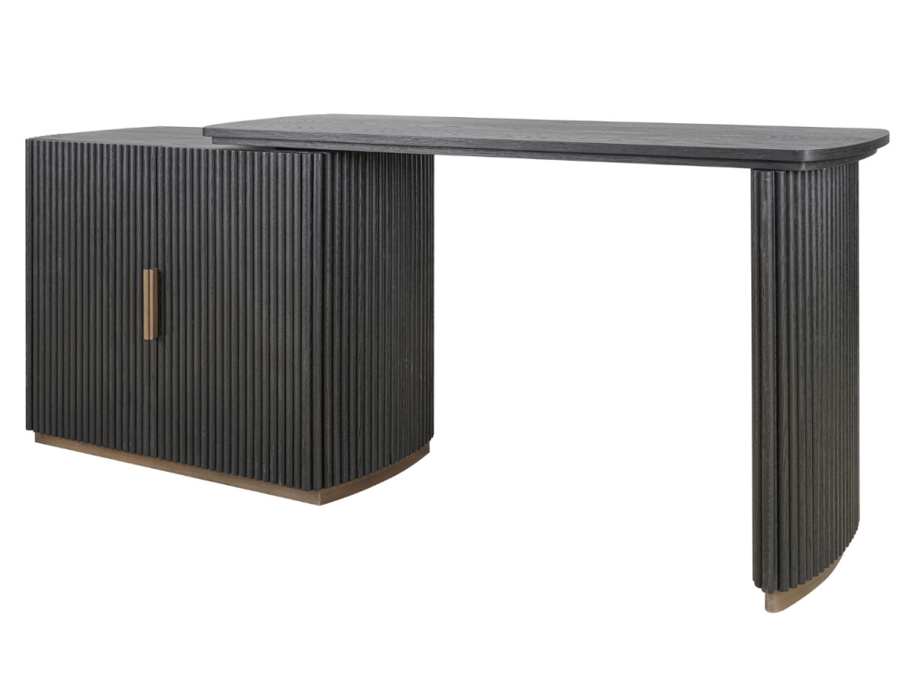 Pracovní stůl Cambon bude nejen funkčním, ale i esteticky výrazným prvkem vaší pracovny. Jeho černá barva v dubové dýze a lamelová textura vytvářejí dojem bytelnosti a elegance. Otočná deska vám umožní přizpůsobit si uspořádání stolu přesně podle vašich potřeb. Zabudovaná skříňka poskytne praktický úložný prostor na dokumenty či kancelářské doplňky. Zlaté detaily dodávají celku lehký nádech luxusu, který vynikne v interiérech s art deco či industriálním laděním.