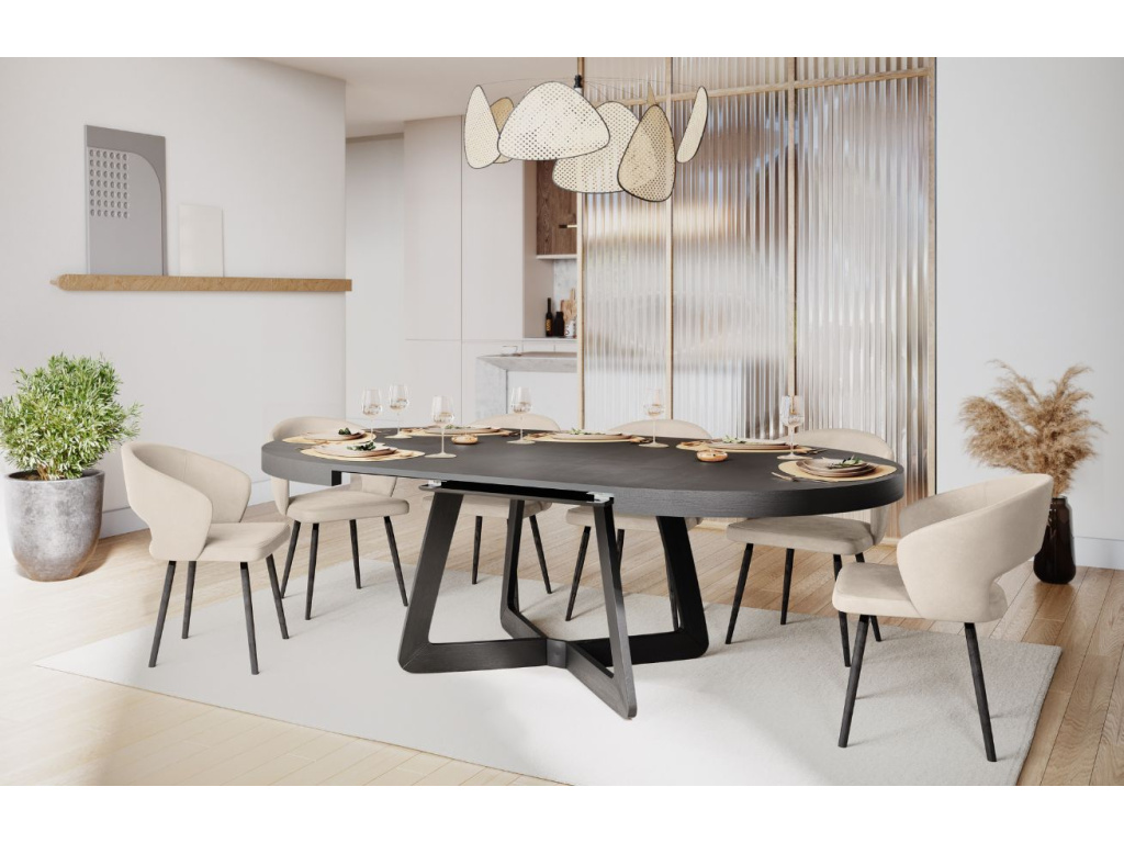 Jídelní stůl Dustin je dokonalou kombinací elegance, funkčnosti a moderního designu. Kulatá dýhovaná deska s možností rozložení snadno přemění stůl na oválný, čímž vytvoří dostatek prostoru až pro 8 osob. Stabilní masivní podnož s originálním tvarem dodá nábytku jedinečný charakter a pevnost, zatímco zakřivené linie přinesou lehkost a sofistikovaný vzhled. Tento stůl skvěle zapadne do moderních i klasických interiérů, kde se stane stylovým centrem jídelny či obývacího prostoru. Perfektně ladí s jídelními židlemi se sametovým nebo čalouněným potahem, se kterými vytvoří elegantní a vkusný celek. Užijte si rodinné večeře i setkání s přáteli u stolu, který spojuje praktičnost s nadčasovým designem.